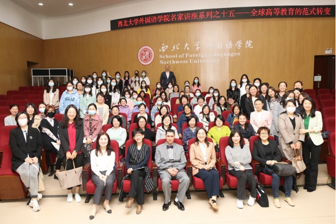 At 4:30 PM,April 26, 2023, Professor Ray Taheri from the University of British Columbia in Canada was invited to give the 15th lecture in the “Distinguished Lecture Series” at the School of Foreign Languages, Northwest University. The lecture, titled “Global Paradigm Shift in Higher Education”, was held in the Lecture Hall of the Second Classroom of our school and was attended by around a hundred faculty and students.