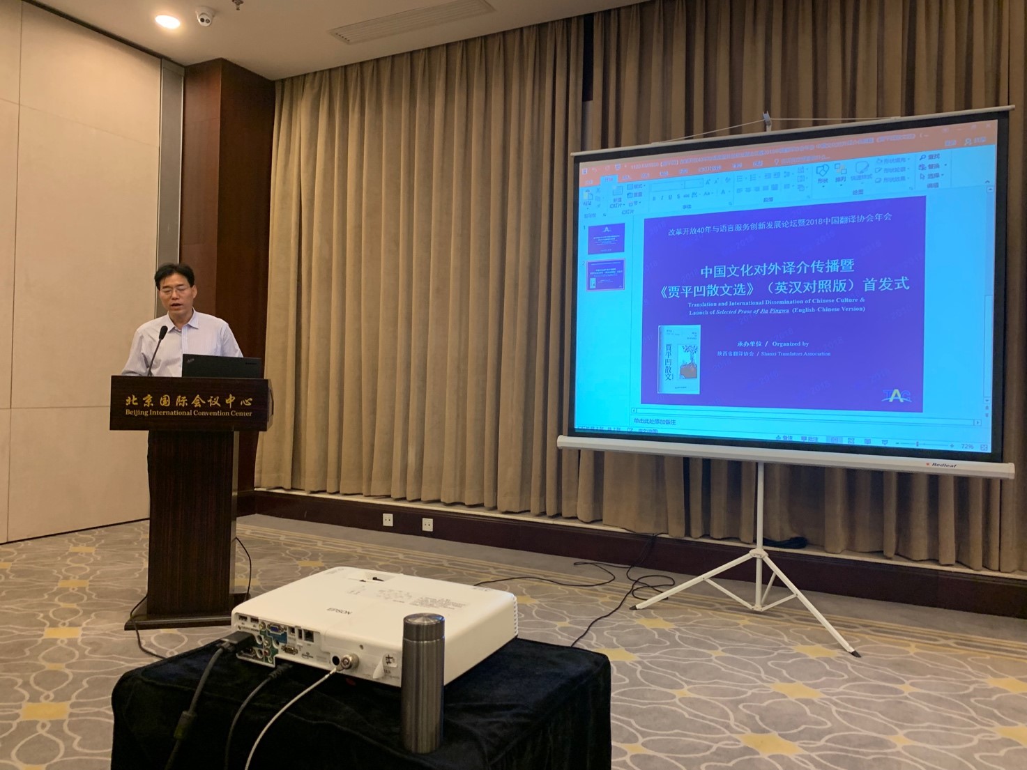 应中国翻译协会邀请,陕西省翻译协会在“改革开放40年与语言服务创新发展论坛暨2018中国翻译协会年会”上承办中国文化对外译介传播主题论坛暨《贾平凹散文集》(汉英对照版)首发式。