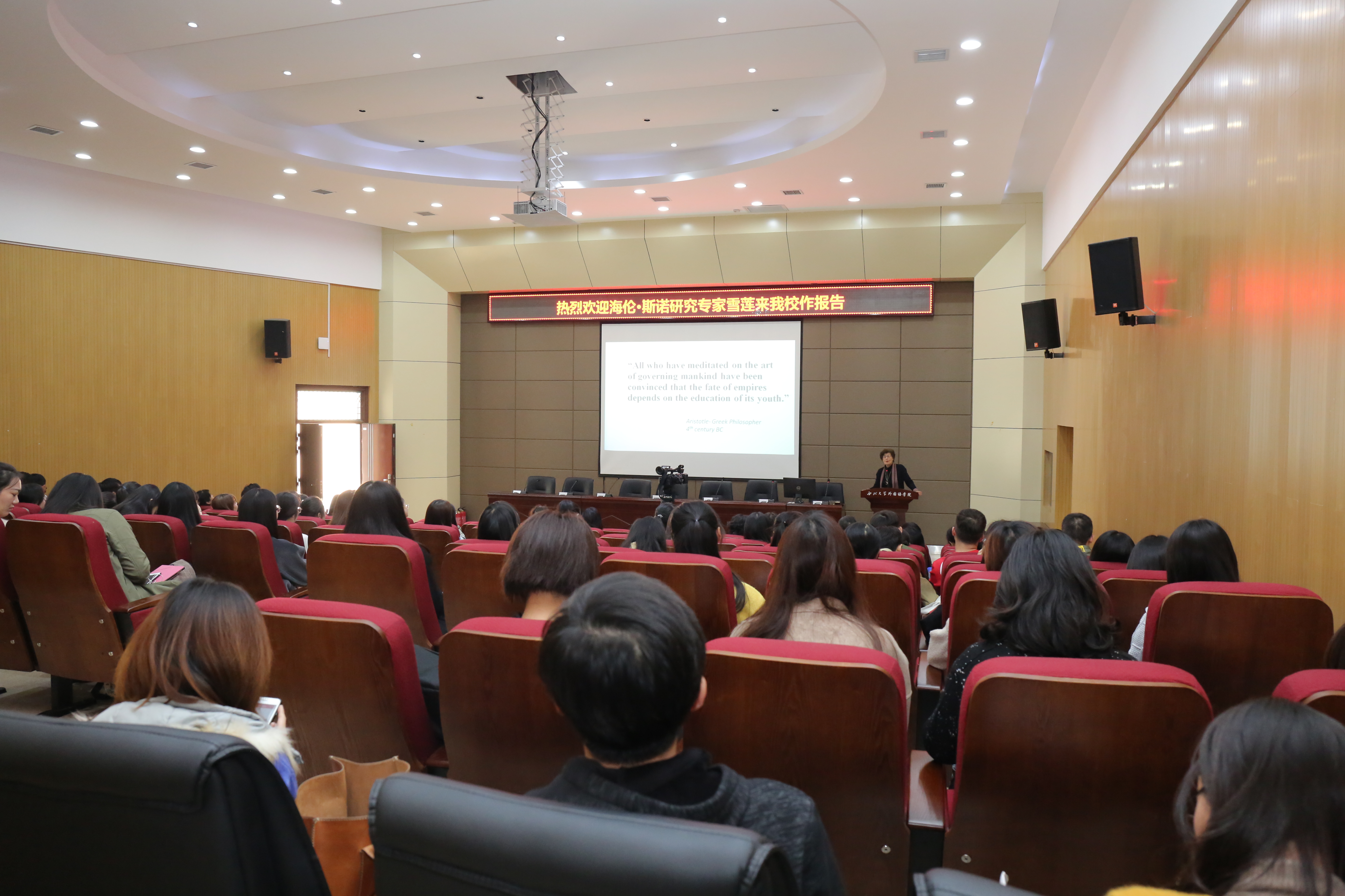 10月24日下午,美国著名中国现代史专家、社会活动家雪莲•估伦女士应外国语学院邀请,在我院外语第二课堂作了题为“中美教育”的报告。讲座由外国语学院院长胡宗锋教授主持。