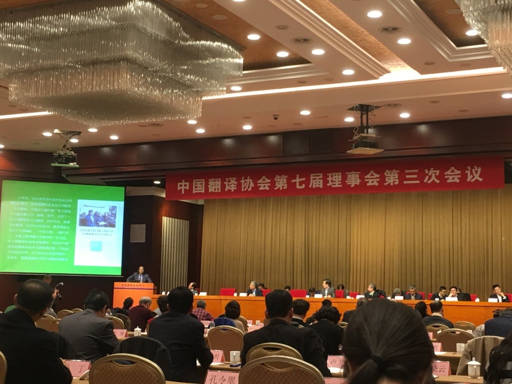 陕西省翻译协会主席、我院胡宗锋教授和高敏娜秘书长代表陕西省翻译协会出席了在北京召开的“中国翻译协会第七届理事会第三次会议”。会前,胡宗锋院长向中国翻译协会常务副会长黄友义赠送了协会SLOT计划(陕西文学世界推广计划)新近成果贾平凹作品《土门》(英译)以及《罗宾博士看陕西》和《探究中国》等译作、著作。