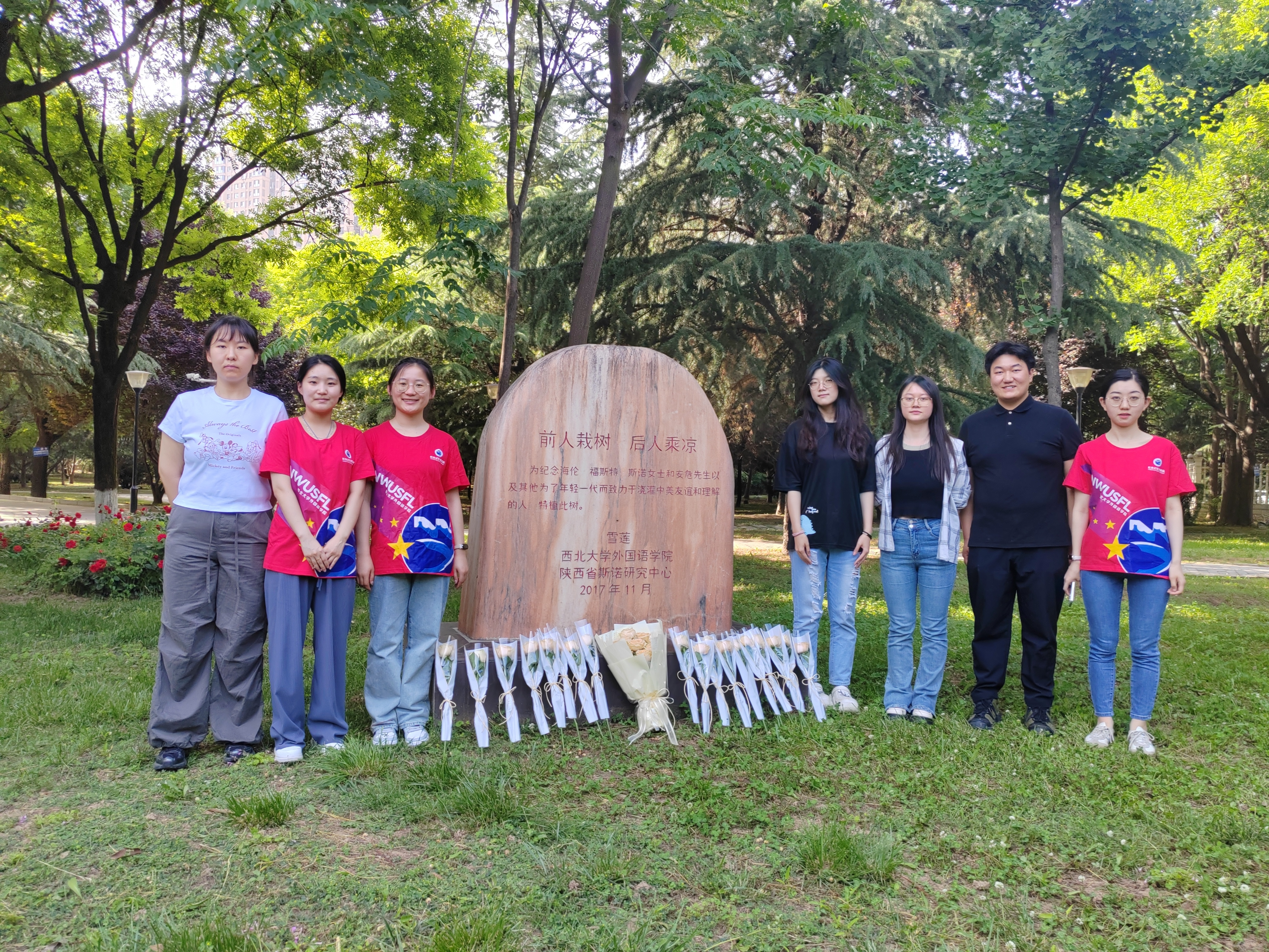 陕西省斯诺研究中心主任胡宗锋,我院党委书记王军,教师代表高敏娜、袁西玲、陈娟,以及学生代表参与了接待与拍摄,并与亚当、省广电局和省友协的探班人员一起,在中美友谊纪念碑前献花。